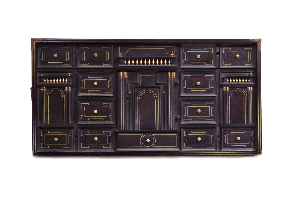 MONETIERE IN EBANO E AVORIO, XVIII SECOLO, fronte architettonico a cassettini e antine, decori a filettature geometriche; restauri, usure e sbeccature.