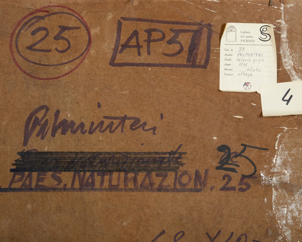 PALMINTERI GIANNI (1924 - 1996) VELONIA GRIGIA. 1978. Affresco su tavola. Cm 48,50 x 40,50. sul retro: firma, etichetta Galleria del Ponte , Vicenza
