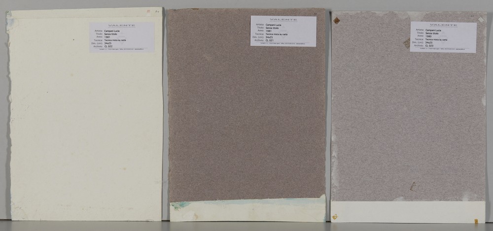 CAMPANI LUCIA LOTTO COMPOSTO DA N.3 DISEGNI: SENZA TITOLO. tecnica mista su carta. Cm 25,00 x 34,00. Lotto composto da tre disegni: senza titolo, 1981; senza titolo, 1981 e senza titolo, 1980.