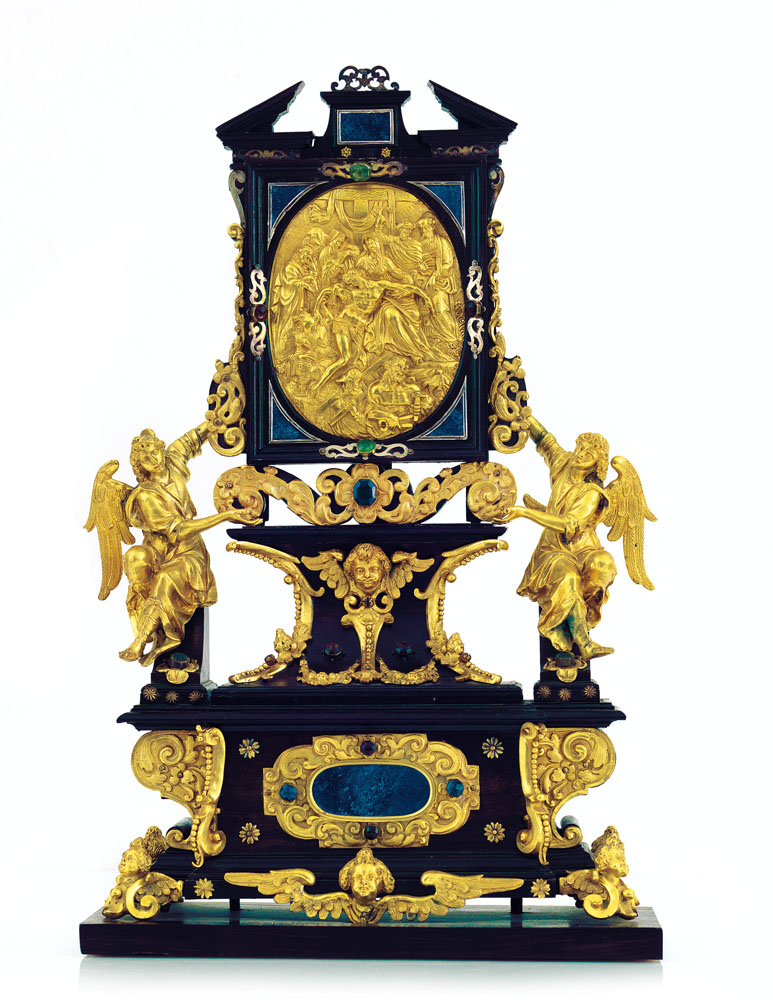 IMPORTANTE ALTARE BAROCCO IN BRONZO DORATO, LEGNO EBANIZZATO, LAPISLAZZULI E PIETRE DURE, ROMA, XVII SECOLO, a struttura architettonica centrato da placca ovale cesellata raffigurante la Deposizione retta da due angeli, sostegno ad urna decorata da volute, fregi, teste d'angelo ed applicazioni vitree policrome.