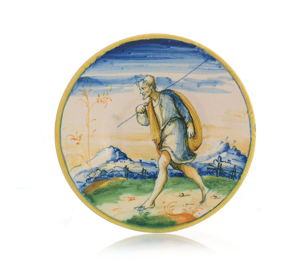 PIATTO ISTORIATO IN MAIOLICA, VENEZIA, BOTTEGA DI MASTRO DOMENICO, TERZO QUARTO DEL XVI SECOLO, decoro policromo raffigurante viandante entro paesaggio.