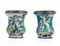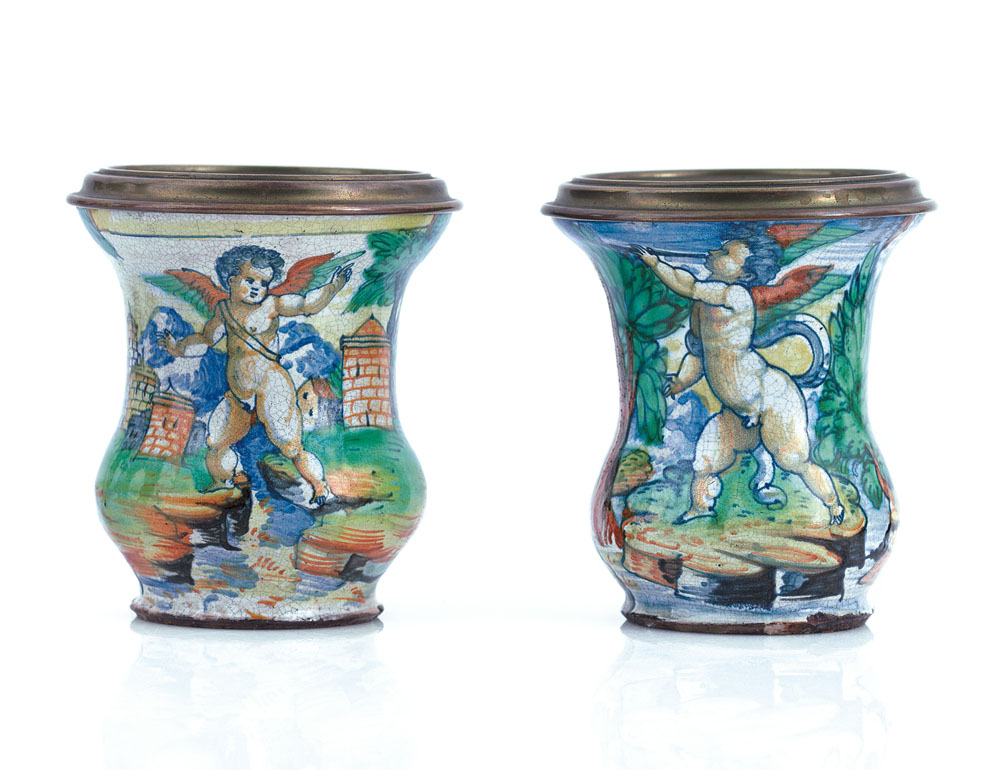 COPPIA DI ALABARELLI IN MAIOLICA, XVI SECOLO, decoro policromo a paesaggio continuo con amorino; modifica al collo, rivestimento interno in ottone, foro sul fondo.