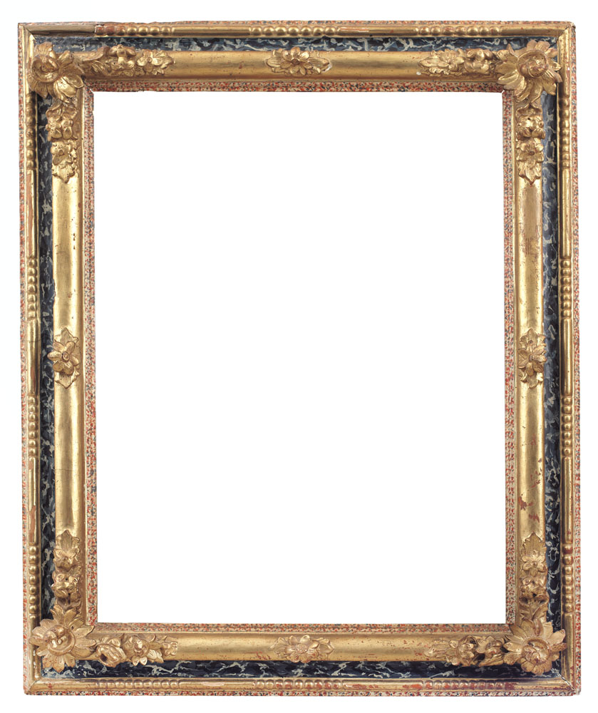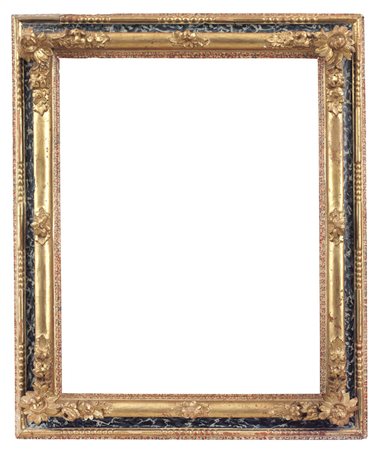 CORNICE IN LEGNO SCOLPITO, DIPINTO E DORATO, INIZIO XVIII SECOLO, rettangolare con intagli a più ordini con decori a fiori scolpiti e baccellature; usure e sbeccature.