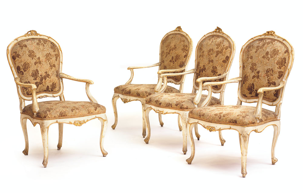 MOBILE DEL XVIII SECOLO QUATTRO POLTRONE IN LEGNO SCOLPITO, DIPINTO E DORATO,...