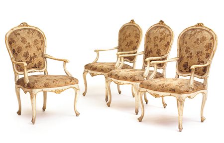 QUATTRO POLTRONE IN LEGNO SCOLPITO, DIPINTO E DORATO, VENEZIA, XVIII SECOLO, schienali sagomati e sedute imbottite, braccioli mossi e gambe arcuate con fascia centinata; usure e sbeccature.