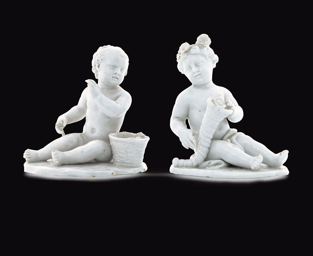 DUE SCULTURE IN PORCELLANA BIANCA, COZZI, XVIII SECOLO, raffiguranti bimbi allegorici con fiori e frutta; lievi sbeccature.