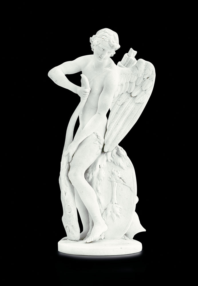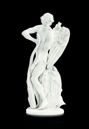 SCULTURA IN BISCUIT, FRANCIA, XIX SECOLO, raffigurante Cupido con arco e frecce, base circolare.