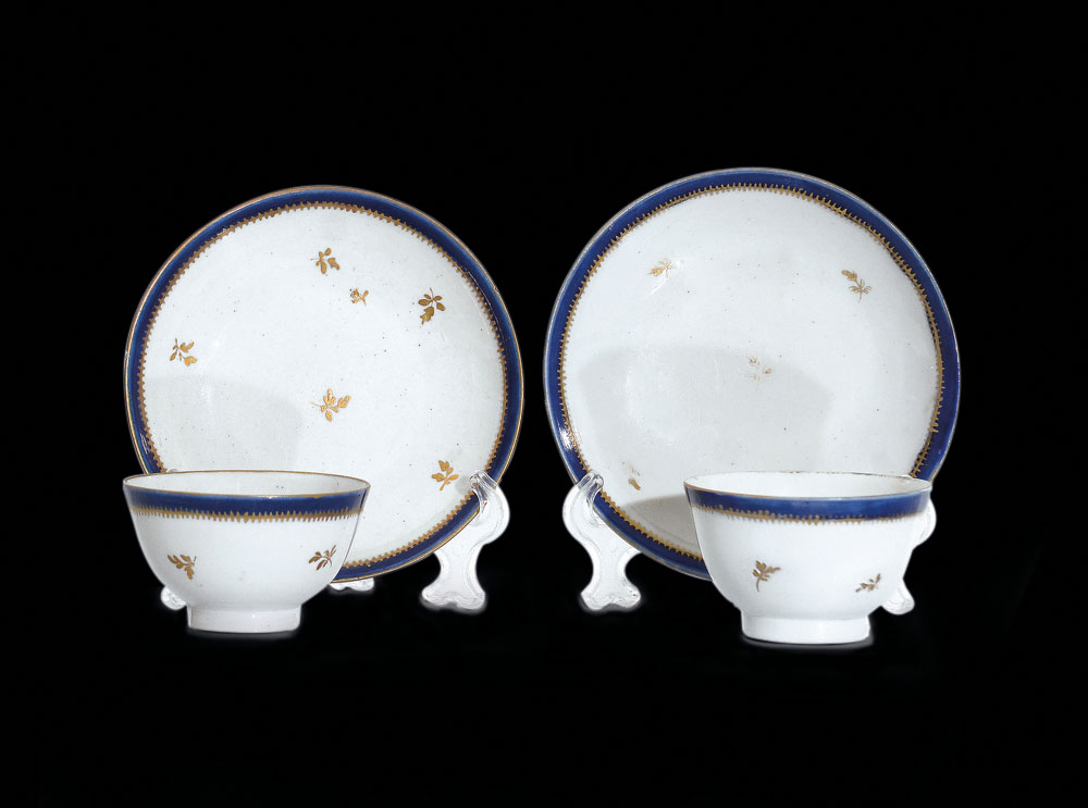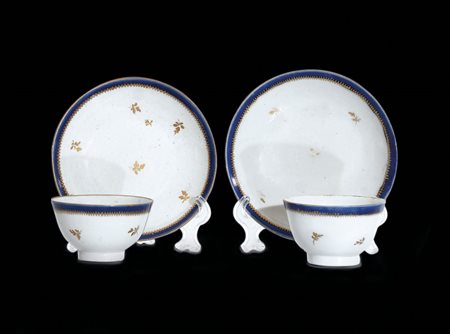 COPPIA DI TAZZE CON PIATTO IN PORCELLANA, COZZI, VENEZIA, SECONDA META' XVIII SECOLO, decoro a rametti fogliati in oro, bordo blu con profili in oro; marca ancora rossa.