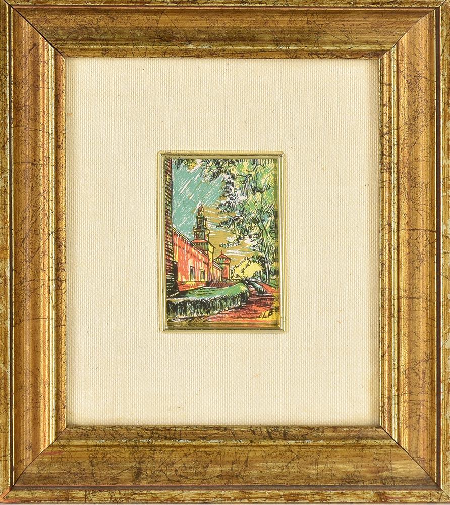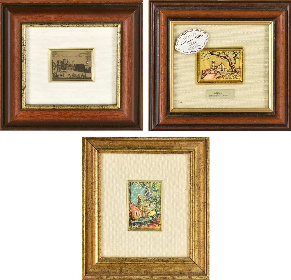 comoposto da tre incisioni su lastra di metallo e oro raffiguranti vedute di Assisi e Milano
