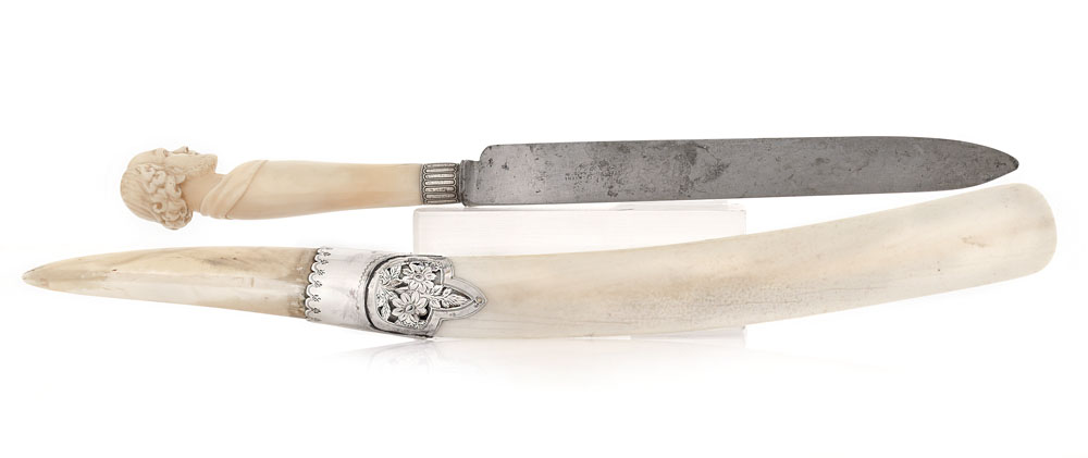 DUE TAGLIACARTE IN AVORIO, XIX SECOLO, uno con impugnatura a figura e uno in avorio e argento con punzoni di Londra, 1893.