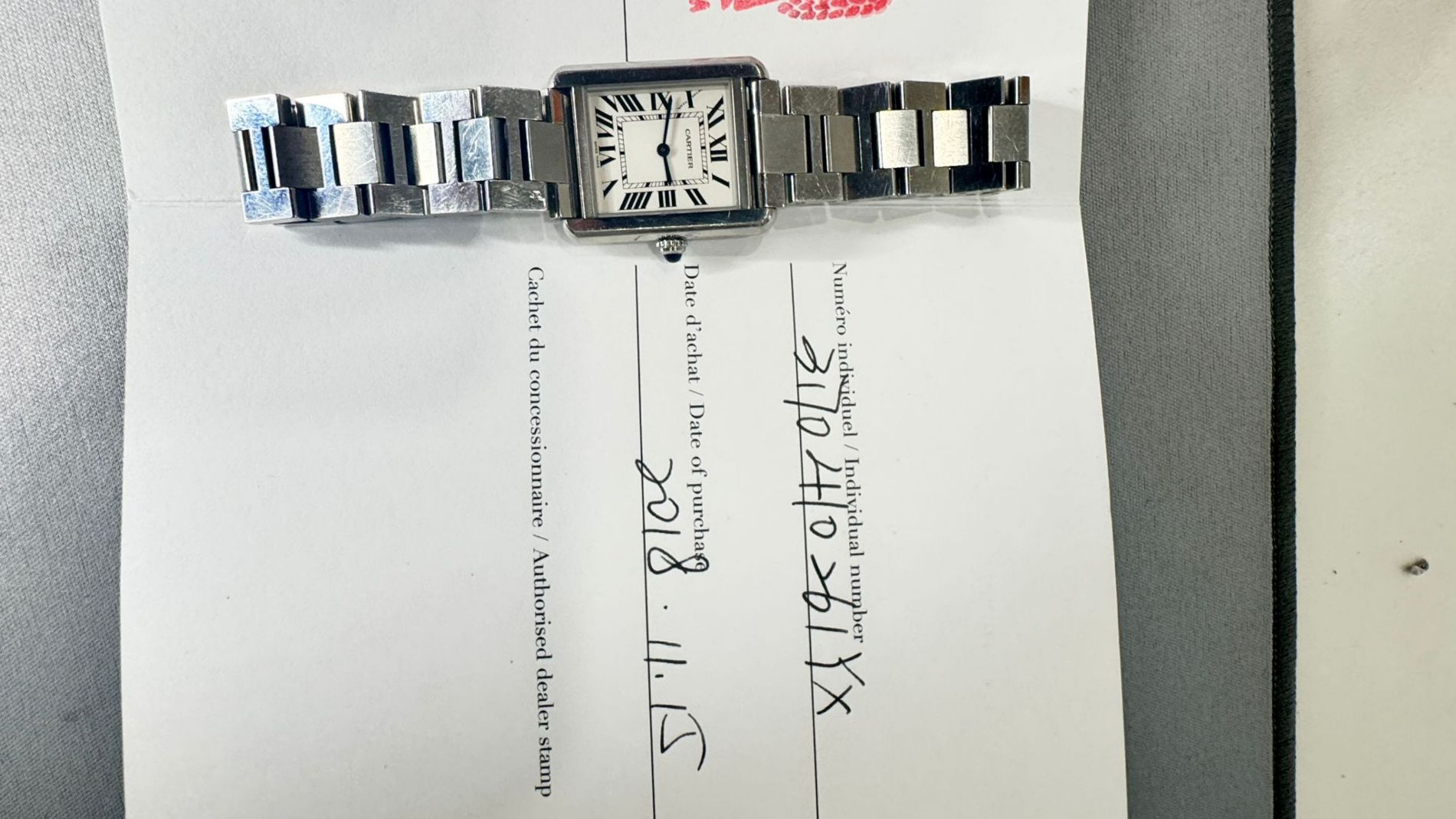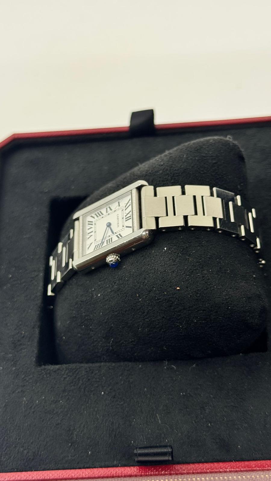 Marca Cartier Modello (Orologio) Tank Solo Numero di referenza 3170 Carica Quarzo Materiale della cassa Acciaio Materiale cinturino Acciaio Anno di produzione 2018 Documenti originali e scatola Carica Quarzo Cassa Materiale della cassa Acciaio Diametro 24 x 31 mm Impermeabile 3 ATM Materiale lunetta Acciaio Vetro Vetro zaffiro Numeri sul quadrante Romani Cinturino Materiale cinturino Acciaio Colore cinturino Acciaio Chiusura Déployante Materiale chiusura Acciaio