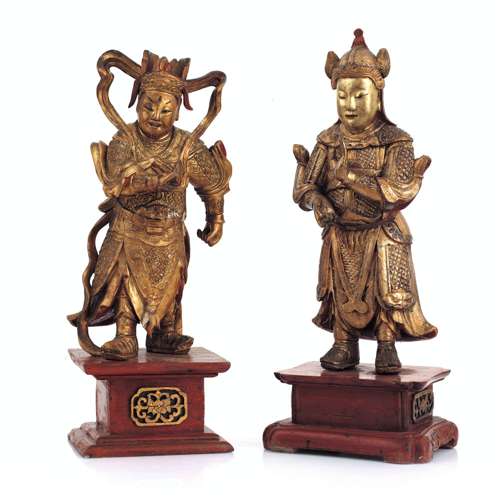 DUE SCULTURE IN LEGNO DORATO, CINA, XIX SECOLO, raffiguranti guerrieri su basi in legno tinto; restauri, difetti e mancanze.