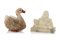 DUE SCULTURE, CINA, XX SECOLO, raffiguranti un Buddha in alabastro e un cigno in cristallo di rocca; sbeccature e rincollI.