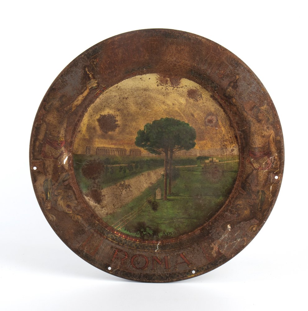 Vassoio pubblicitario del Ferro China Baliva in latta litografata, con Gladiatore e rovine romane. Pessime condizioni, da restaurare. Diametro cm.37