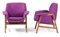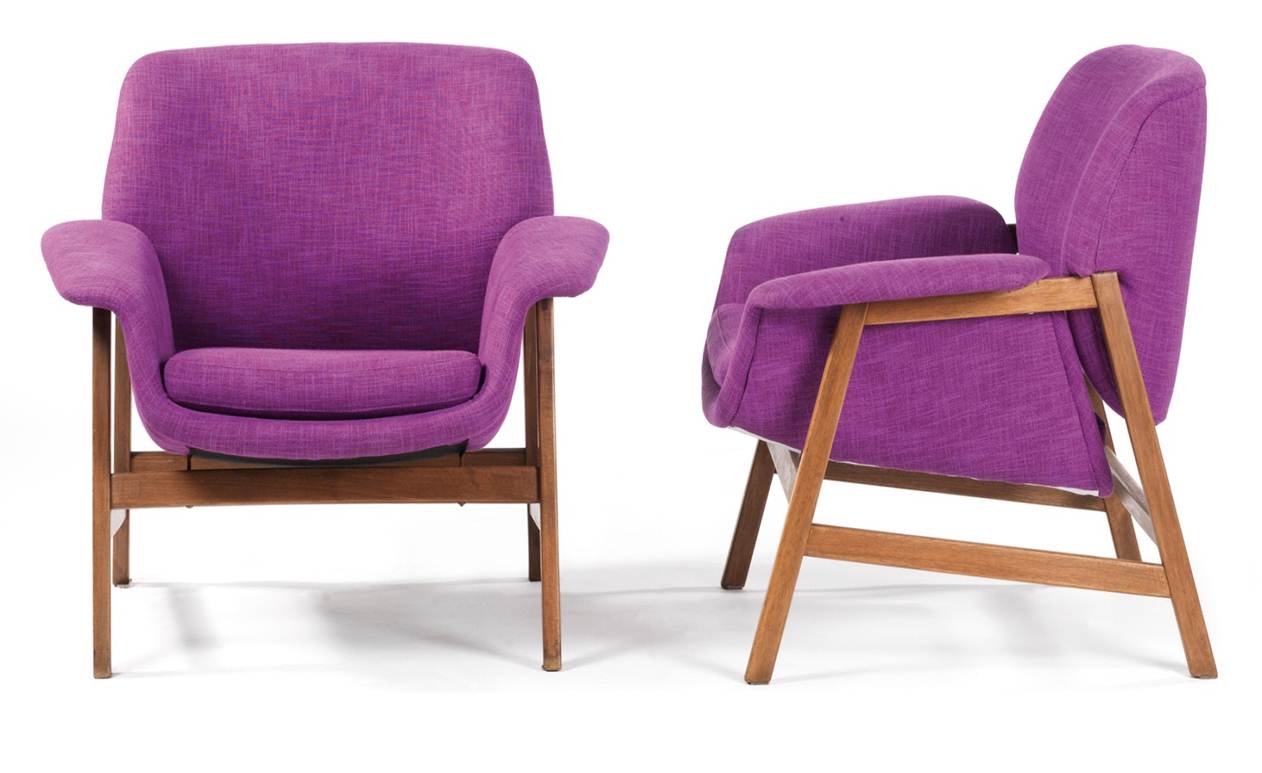 Gianfranco Frattini (Padova, 1926 - Milano, 2004) Due poltrone 849 Produzione: Cassina, 1956 Struttura in noce, rivestimento in cotone grosso viola cm 75 h x 82 x 70