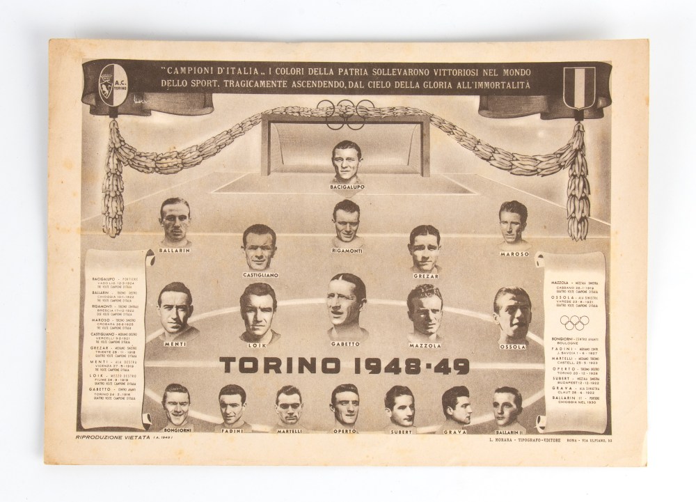 Cartoncino commemorativo del Grande Torino anno 1948-49. Tipografia L.Morara - Roma Via Ulpiano 53. Buone condizioni