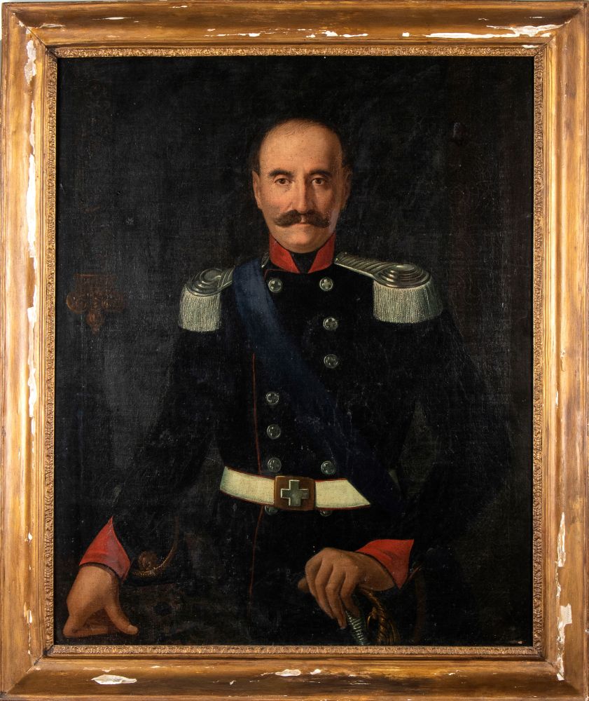 Ritratto di ufficiale della Guardia Nazionale italiana, olio su tela, in cornice coeva. Non firmato. Misure della tela circa cm.95x77
