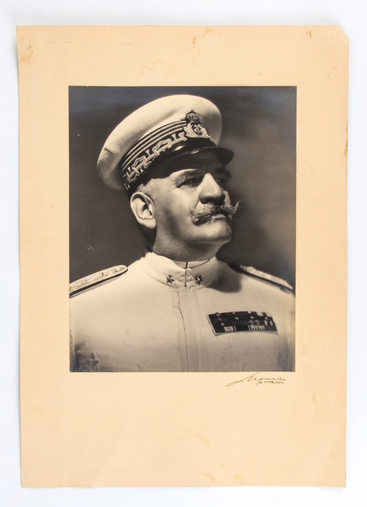 Fotografia in b/n di Costanzo Ciano, in uniforme da Grande Ammiraglio della Regia Marina, applicata su cartoncino firmato in basso a destra LUXARDO Roma XVII - Misura circa cm.33x47