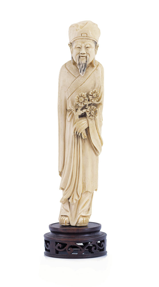 SCULTURA IN AVORIO, CINA, INIZIO XX SECOLO, raffigurante santone con fiori su base traforata in legno; firma incisa al retro.