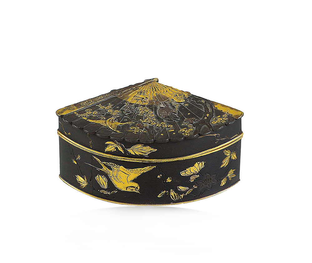 TABACCHIERA IN ARGENTO DECORATA A SMALTI, GIAPPONE, XIX SECOLO, a forma di ventaglio con decori in oro a fiori e uccelli entro paesaggio.