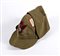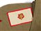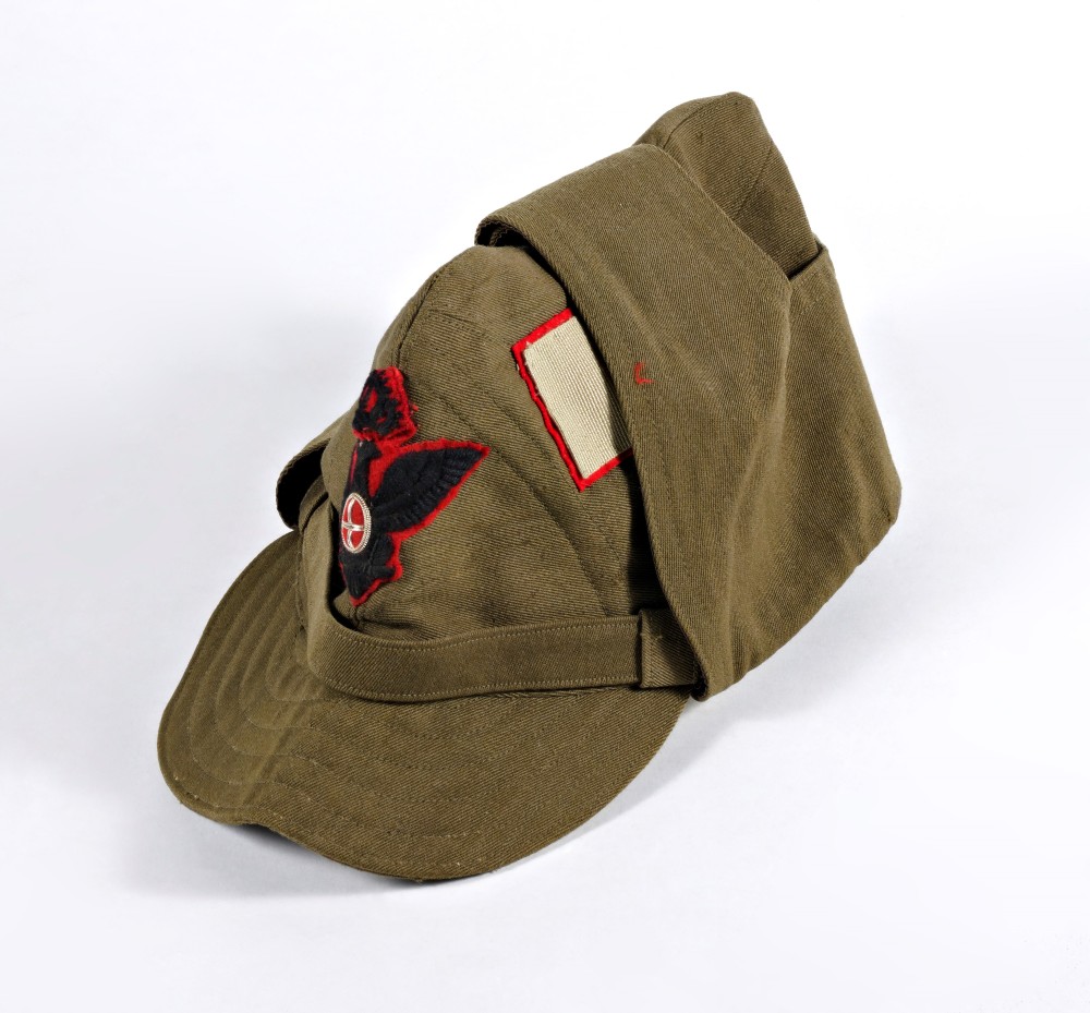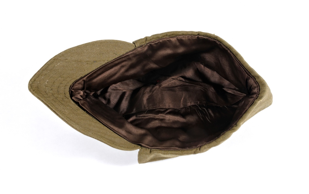In gabardin cachi, fregio ricamato di cotone nero su panno rosso, gallone laterale di nastro di cotone con stella gialla bordata rosso, interno di seta, in ottimo stato.