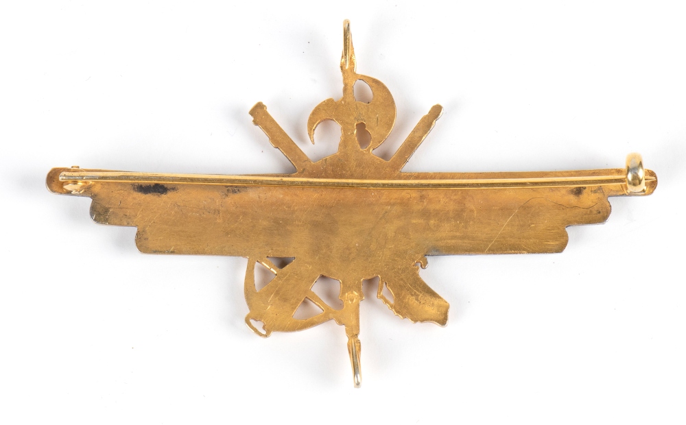 Bellissimo brevetto d'onore da pilota del Tercio del periodo della guerra civile, in argento gettato, cesellato parzialmente dorato, al verso spilla longitudinale e ganci, in ottimo stato, concesso di solito a piloti tedeschi o italiana partecipanti agli eventi bellici della guerra civile di Spagna. Raro, in ottimo stato.