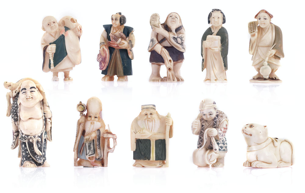 Lotto 726 | AVORIO LOTTO DI DIECI NETSUKE-OKIMONO IN AVORIO E OSSO, XX SECOLO,...