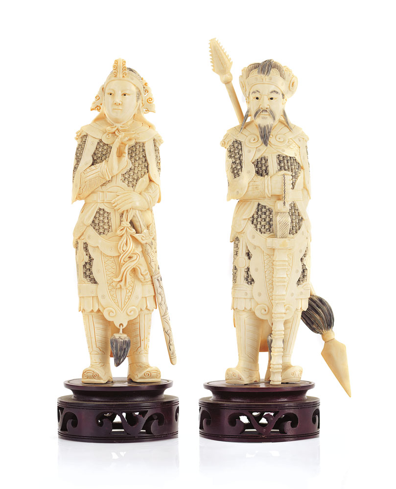 AVORIO COPPIA DI SCULTURE IN AVORIO, CINA, XX SECOLO, raffiguranti guerrieri...