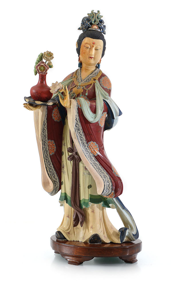 SCULTURA IN LEGNO DIPINTO E AVORIO, CINA, XX SECOLO, raffigurante kwan yin con vassoio, decoro policromo; sbeccature e usure.