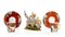 UN CALAMAIO IN CERAMICA E COPPIA DI TAZZE CON PIATTO LIBERTY IN PORCELLANA, GINORI, 1890 CA., calamaio policromo a grifo con vaso, marca "Ginori" coronata e numerali in blu, tazze con volti femminili e fiori su fondo rosso, marca "Ginori " in verde.