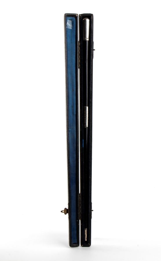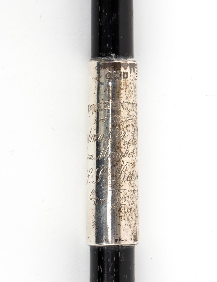 Lunghezza: 52 cm. Peso: 85 gr; peso con scatola: 220 gr. fusto in legno ebanizzato con impugnatura liscia, dettaglio centrale e terminale in argento. L'iscrizione nella parte centrale recita: "PRESENTED TO BANDMASTER J. SADLER. FROM MEMBERS OF J. S. S. BAND OCT. 2ND 1913".