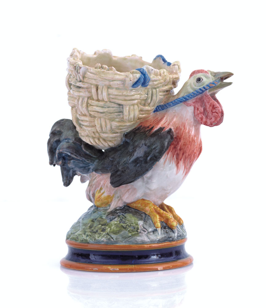 SCULTURA IN CERAMICA, GINORI, INIZIO XX SECOLO, raffigurante gallina con cesta; decoro policromo, marca "Ginori" coronata e numerali in blu; lieve restauro e sbeccature.