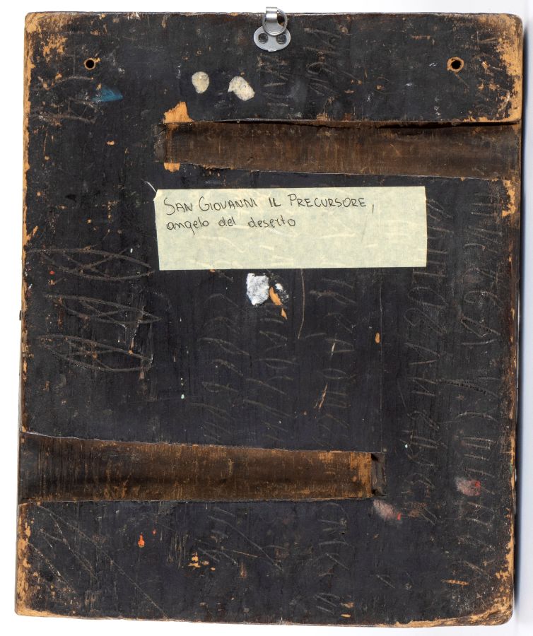 Altezza x larghezza x profondità: 36,6 x 31,4 x 3 cm. tempera su tavola; San Giovanni è l'ultimo profeta che costituisce il legame e il ponte tra il Vecchio ed il nuovo Testamento. Concepito miracolosamente, egli era il figlio del profeta Zaccaria e di Elisabetta, una parente della Vergine. A trent'anni cominciò la penitenza: era un grande asceta, viveva nel deserto, portava un abito di pelo e si nutriva di cavallette. La presenza delle ali simboleggia lo stato di Giovanni come messaggero divino.
