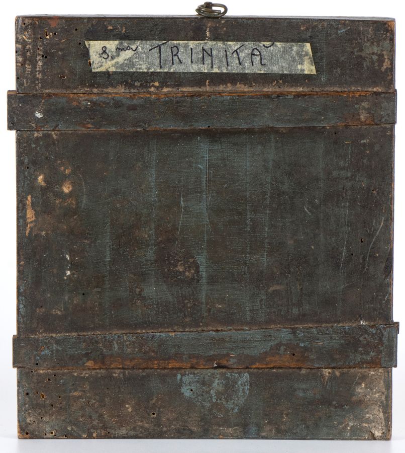 Altezza x larghezza x profondità: 26,8 x 24 x 2,4 cm. tempera su tavola; la Santissima Trinità è dottrina fondamentale e più importante delle chiese cristiane; in essa sono rappresentati Dio Padre, creatore del cielo e della terra, Gesù Cristo, il Figlio generato dal Padre prima di tutti i secoli, e lo Spirito Santo che il Padre e il Figlio mandano ai discepoli di Gesù per far loro comprendere e testimoniare le verità rivelate. Classificazione dello stato di conservazione: **** buono.