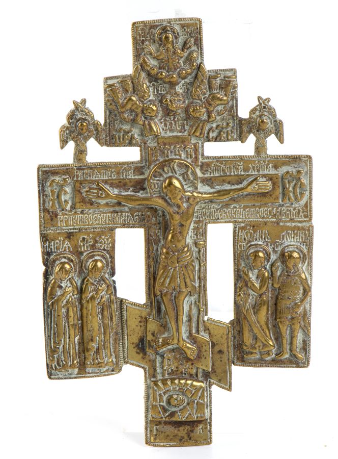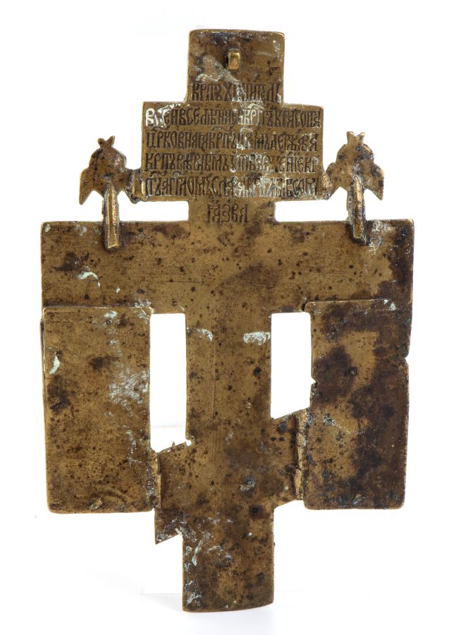 Icona russa da viaggio in bronzo raffigurante la croce ortodossa XIX secolo Altezza x larghezza x profondità: 17,3 x 10,6 x 0,3 cm. Peso: 286 gr.