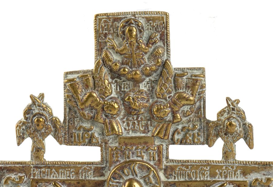 Icona russa da viaggio in bronzo raffigurante la croce ortodossa XIX secolo