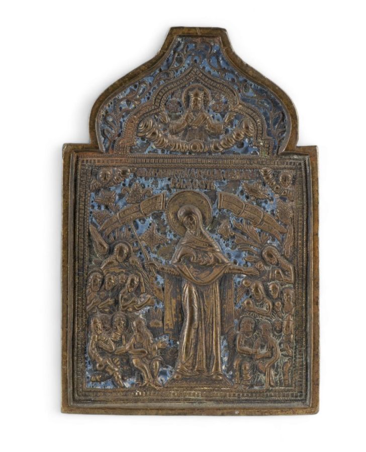 Altezza x larghezza: 10,5 x 8,5 cm. Peso: 505 gr. In bronzo dorato e smalti raffigurante la Madre di Dio Gioia degli Afflitti, glorificata nel 1688 dopo l'intercessione e la miracolosa guarigione della sorella del patriarca Ioachim.