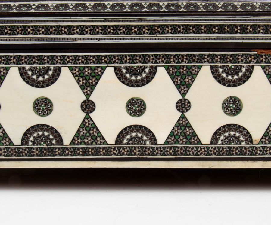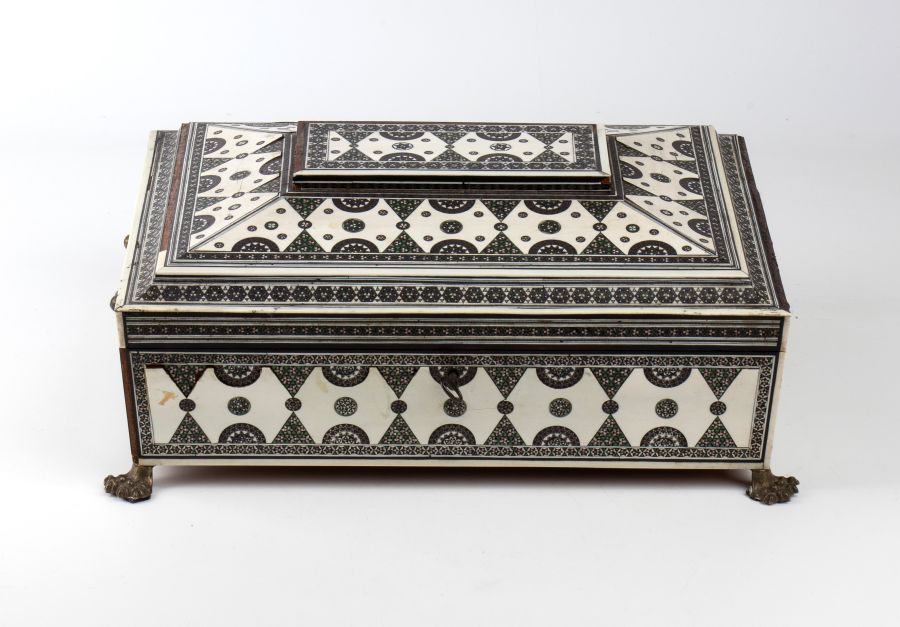 Scatola scrittoio da viaggio intarsiata in avorio Anglo-indiana XIX secolo Altezza x larghezza x profondità: 24 x 32 x 11 cm. Peso 2285 gr.