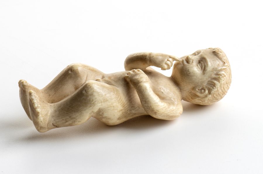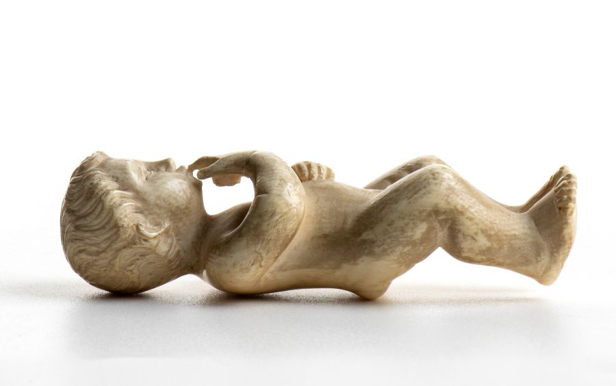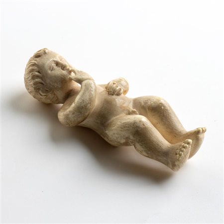 Altezza x larghezza x profondità: 8,7 x 3,4 x 2,5 cm. Peso: 46 gr. in avorio di elefante scolpito a tutto tondo (Elephas maximus Linnaeus, 1758 o Loxodonta africana Blumenbach, 1797) raffigurante un Bambino Gesù.