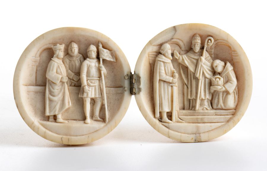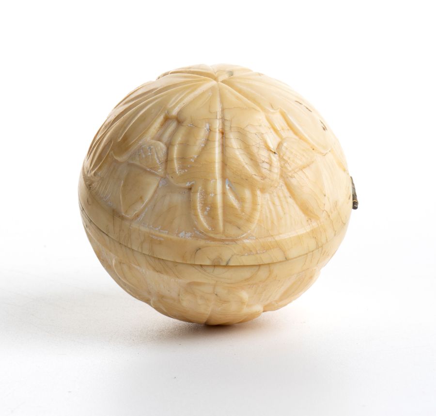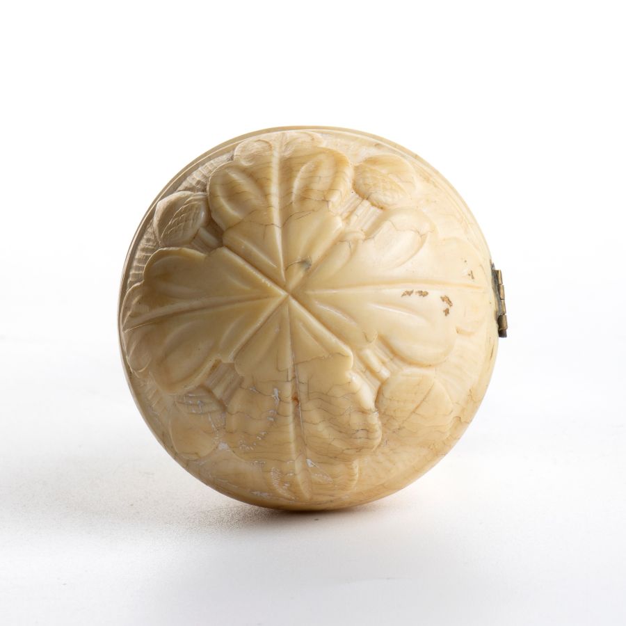 Dittico a sfera pieghevole in avorio Francia, Dieppe (?), XIX secolo Diametro x larghezza aperto: 5,2 x 10,5 cm. Peso: 110 gr