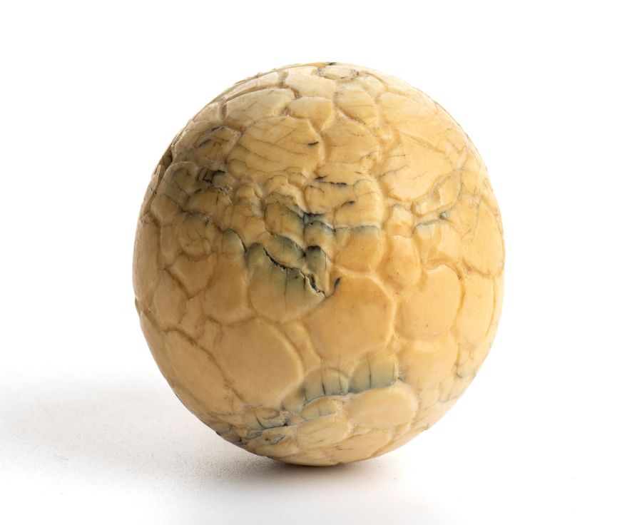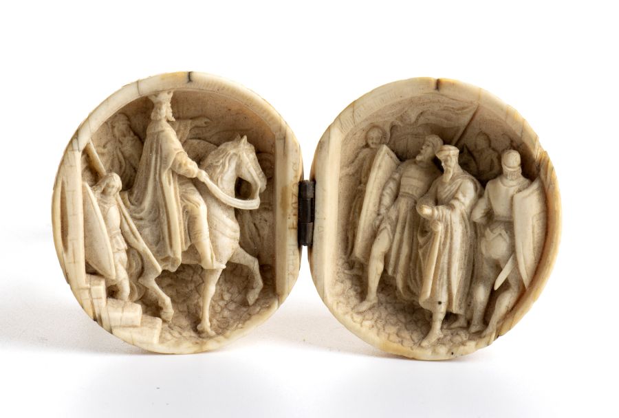 Dittico a sfera pieghevole in avorio Francia, Dieppe (?), XIX secolo Diametro x larghezza aperto: 5,7 x 10,1 cm. Peso: 98 gr