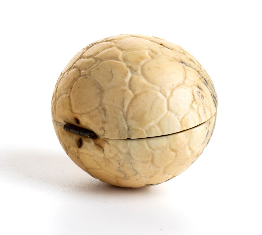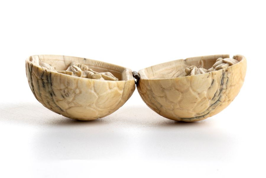 I dittici sferici apribili furono prodotti essenzialmente in Francia e in Germania tra il XVIII e il XIX secolo, riprendendo la tradizione dei Prayer nuts. Il termine inglese Prayer nut o Prayer beads deriva dall'equivalente olandese gebedsnoot, ed è entrato nell'uso comune nel XVIII secolo. L'uso della parola "noce" potrebbe derivare dal fatto che alcune perle erano effettivamente intagliate da noci o noccioli, pratica diffusa nella Germania meridionale medievale. Sono tipicamente apribili a metà e intagliati all'interno di scene religiose cristiane o scene storiche altamente dettagliate e intricate. Le loro dimensioni variano tra i 2 e i 5 cm di diametro, per lo più della stessa forma, decorati all'esterno con trafori gotici intagliati e teste di fiori. Spesso contengono scene centrali raffiguranti episodi della vita di Maria o della Passione di Gesù e, in alcuni casi, contengono iscrizioni intagliate solitamente legate al significato della narrazione. Questo lotto, accompagnato da certificato CITES e da perizia tecnica rilasciata dal Ce.S.Ar. Centro Studi Archeometrici, è disponibile per la vendita solo con spedizioni all’interno della Comunità Europea. Classificazione dello stato di conservazione: **** buono.