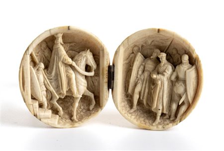 Diametro x larghezza aperto: 5,7 x 10,1 cm. Peso: 98 gr in avorio di elefante intagliato (Elephas maximus Linnaeus, 1758 o Loxodonta africana Blumenbach, 1797). La parte esterna scolpita a tutto tondo con motivi geometrici, all’interno una scena medievale con un re a cavallo con soldati.