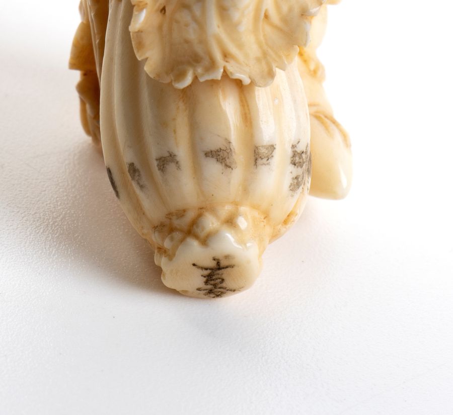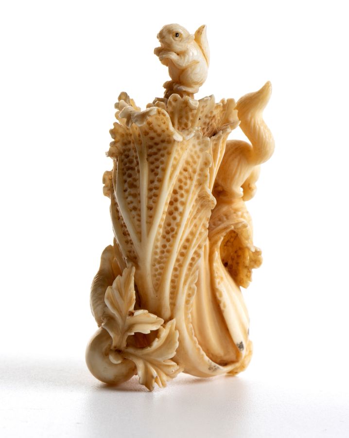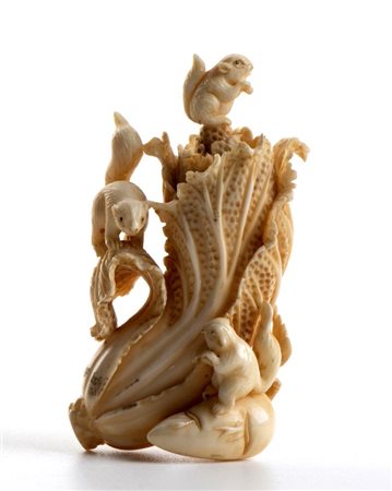 Altezza x larghezza x profondità: 6,6 x 3,2 x 2,2 cm. Peso 24 gr. in avorio marino scolpito (Physeter Linnaeus, 1758 o Orcinus orca, Linnaeus, 1758) raffigurante un cavolo cinese con tre scoiattoli posti sopra di esso. Questo lotto, accompagnato da perizia tecnica rilasciata dal Ce.S.Ar. Centro Studi Archeometrici, è disponibile per la vendita solo con spedizioni all’interno della Comunità Europea. Classificazione dello stato di conservazione: **** buono.