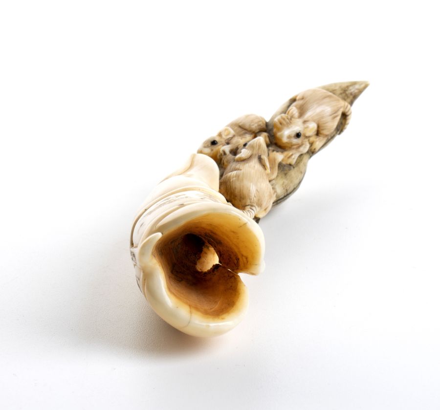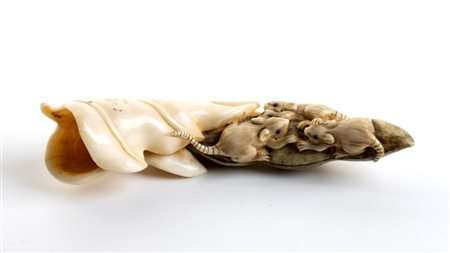 Altezza x larghezza x profondità: 11 x 2,6 x 2,4 cm. Peso: 45 gr in avorio marino (Physeter Linnaeus, 1758 or Orcinus orca, Linnaeus), raffigurante una miriade di topi che si arrampicano su una pianta di piselli.