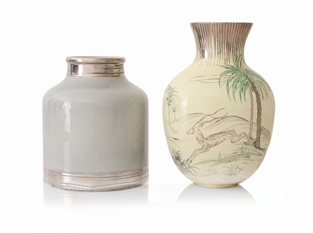 DUE VASI IN CERAMICA, RICHARD GINORI SAN CRISTOFORO MILANO, ANNI '30, uno color ceruleo con bordi argentati e uno con decoro ad animali esotici su fondo giallo, profili in oro.