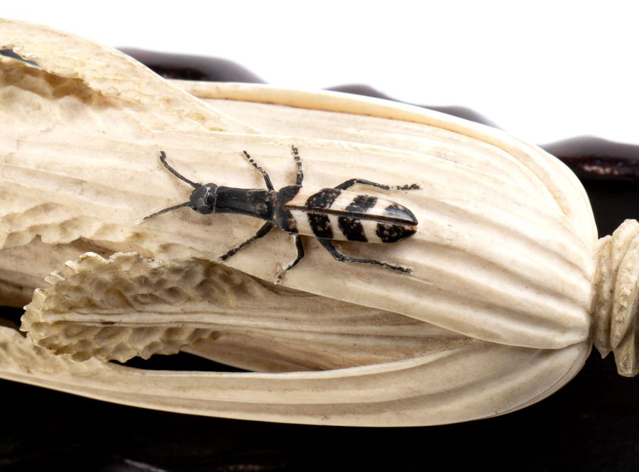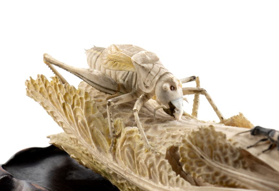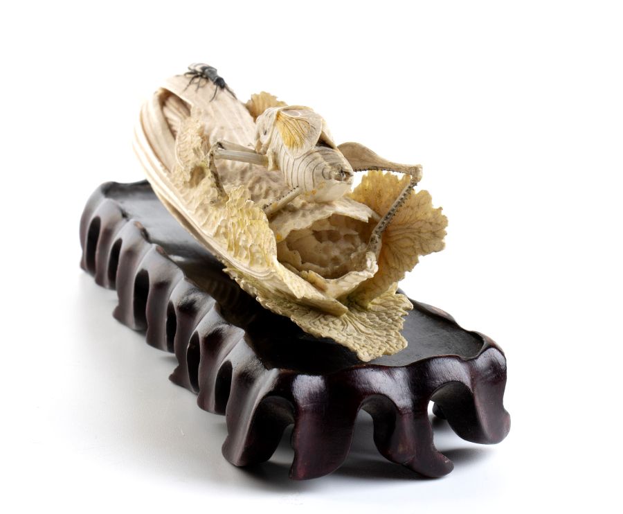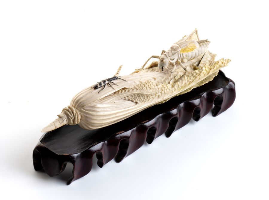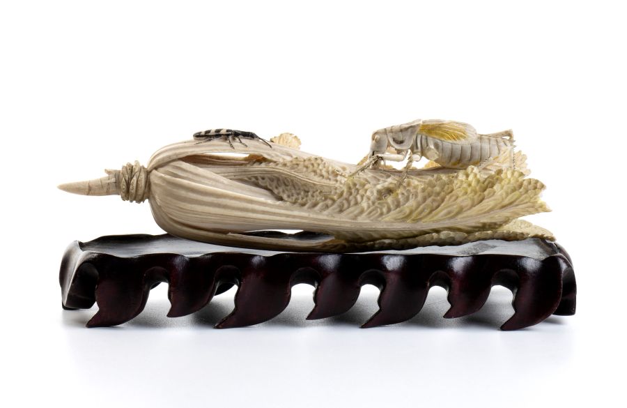 Altezza x larghezza x profondità scultura: 16,2 x 8 x 3,5 cm. Altezza x larghezza x profondità base: 2,4 x 6 x 17 cm. Peso totale: 193 gr. in avorio marino scolpito (Physeter Linnaeus, 1758 o Orcinus orca, Linnaeus, 1758) raffigurante un cavolo cinese con un grillo ed una cavalletta posti sopra di esso. Basamento in palissandro (Dalbergia spp). Questo lotto, accompagnato da perizia tecnica rilasciata dal Ce.S.Ar. Centro Studi Archeometrici, è disponibile per la vendita solo con spedizioni all’interno della Comunità Europea. Stato di conservazione: **** buono.