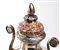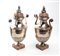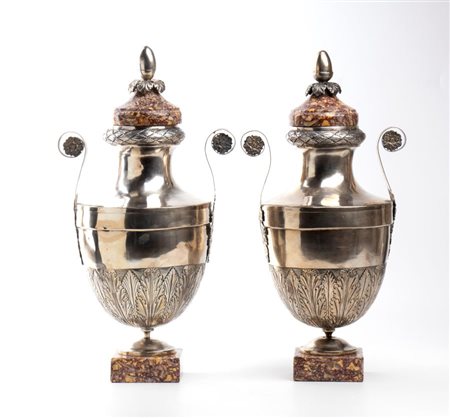 Altezza x larghezza x profondità: 41 x 20 x 16 cm. Peso complessivo lordo: 3350 gr circa. di linea Impero poggianti su basi quadrate in marmo, piede circolare liscio, corpo and anfora con collo liscio rastremato delimitato superiormente da una bordo a foglie d'alloro e decorato con foglie d'acanto nella parte inferiore. Coperchi in marmo e argento con cimatura a ghianda. Manici laterali con pàtere, motivi ornamentali a forma di rosetta circolare.