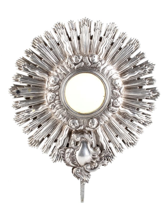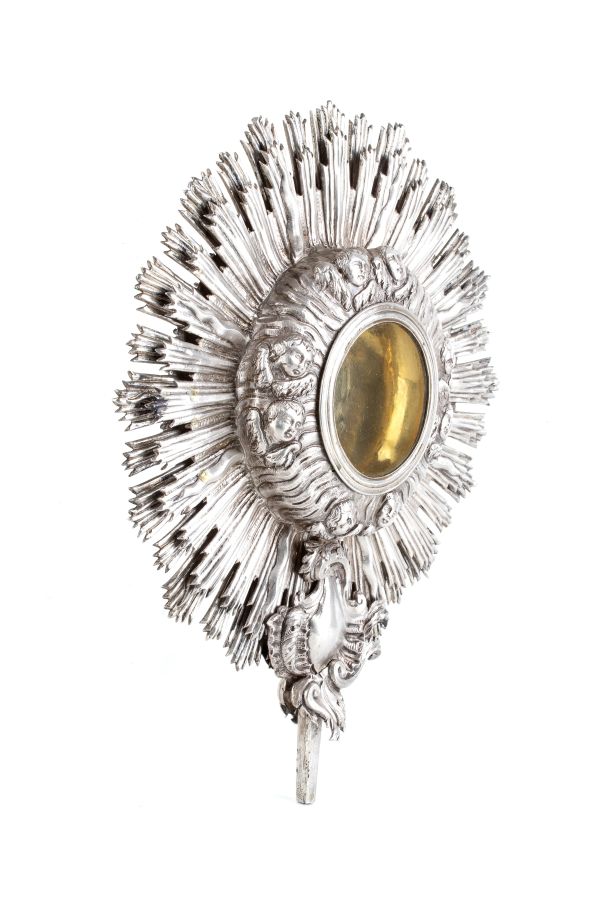 L'ostensorio è un oggetto liturgico utilizzato per l'Eucarestia; la tipologia a raggiera è caratterizzata da una corona di raggi che si sviluppa intorno alla teca centrale volti a simboleggiare la luce divina emanata dal corpo di Cristo, posto al centro della teca. I raggi, in questo caso, sono alternati lunghi e più corti, con fiammelle centrali, che creano un effetto dinamico. Intorno alla teca, teste di cherubini alati escono da raggi e fiamme.