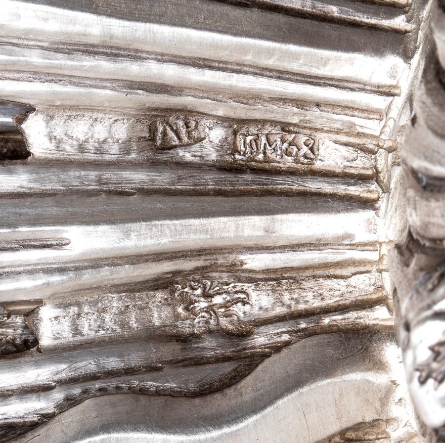 Punzonato con il marchio della "bulla" di Palermo raffigurata da un aquila a volo alto in uso dal 1715 al 1825, con il marchio del console Don Gioachino Carraffa "DSM68" e con il marchio dell'argentiere palermitano Andrea Porzio.